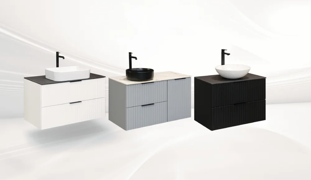 Szafki lakierowane boki proste fronty ryflowane. Do kompletowania z blatami wykonanymi z dowolnego materiału i umuwalkami nablatowymi.